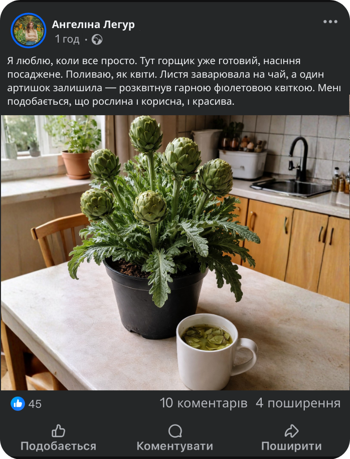 Після отримання горщика достатньо поставити його на світле підвіконня і підтримувати помірний полив. Рослина не зазнає стресу від пересадки, швидко адаптується і починає рости у звичних домашніх умовах. Це зручне рішення для тих, хто хоче вирощувати артишок вдома без досвіду, складних інструкцій і зайвих дій.
