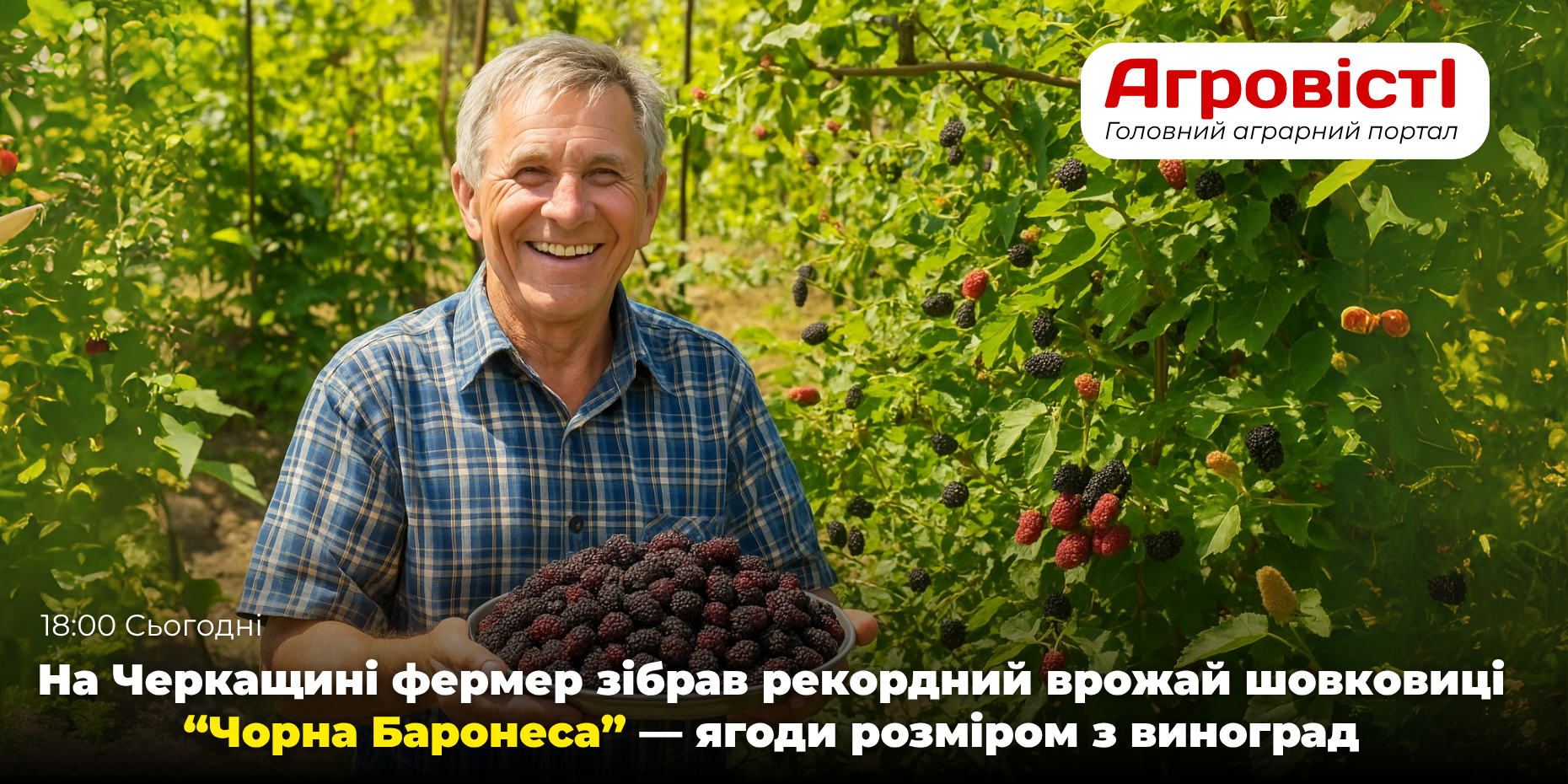Черкаська область, 11 серпня 2025 року — Фермер із Черкащини Микола Гончар зібрав рекордний урожай шовковиці сорту “Чорна Баронеса”, отримавши понад 35 кг ягід з одного дерева. Плоди вражають розміром — до 4,5 см у довжину, насиченим темно-фіолетовим кольором та медовим смаком з легкою кислинкою.